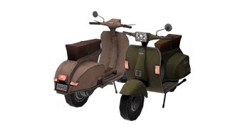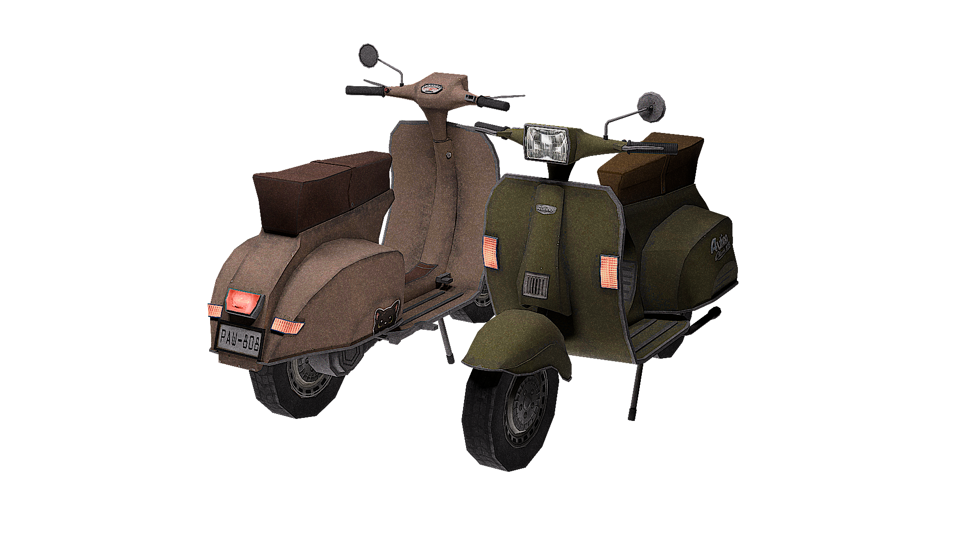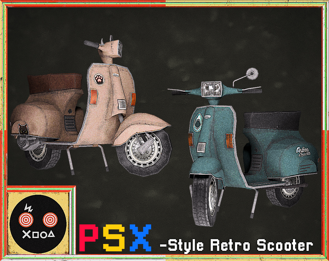 This PSX Style Retro Scooter Pack featuring low-poly pixelated, retro-inspired visuals (not an exact PSX accurate style) with multiple color variants including beige, olive green, yellow, red, orange, and blue-green.